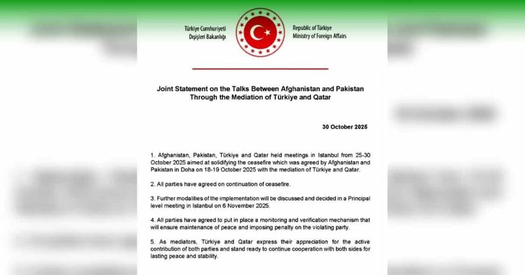 ترکی اور قطر کے ثالثی کردار سے اسلامی جمہوریہ پاکستان اور افغانستان کے درمیان مذاکرات کے بعد باہمی طور پرایک اعلامیہ نشرکیا گیا جس میں بتایا گیا کہ افغانستان، پاکستان، ترکی اور قطر کے نمائندگان نےرواں ماہ 25اکتوبر سے 30 اکتوبر 2025 تک استنبول میں اجلاس کا انعقاد کیا گیا جن کا مقصد اس جنگ بندی کو مضبوط بنانا تھا جو 18اکتوبر اور 19 اکتوبر 2025 کو دوحہ میں ترکی اور قطر کے ثالثی کردار میں پاکستان اور افغانستان کے درمیان طے پائی تھی۔اور مزیدنشر شدہ اعلامیہ کے مطابق تمام فریقن نے جنگ بندی ہونے پر رضا مندی کا اظہار کیا اوراس کو اسی طر ح برقرار رکھنے پر مزید زور دیا گیا اور فیصلہ کن مرحلہ استنبول میں 6 نومبر 2025ء کو اعلیٰ سطح کے منعقد اجلاس میں ہوگا۔